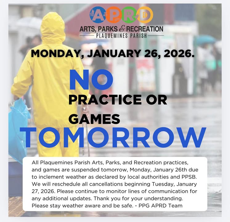 Due to today’s weather, and anticipated overnight conditions which may result in icy conditions on roads, bridges and ferry routes all Plaquemines Parish Arts, Parks, and Recreation practices and games will be canceled , , , . We appreciate your understanding as we work with Parish officials and the school board to prioritize resident safety. We anticipate a return to normal operations and schedules on Tuesday, January 27, 2026. As of now, only necessary basketball games will be rescheduled. Please continue to monitor regular lines of communication for any additional updates. Please stay weather aware and be safe. -PPG APRD Team